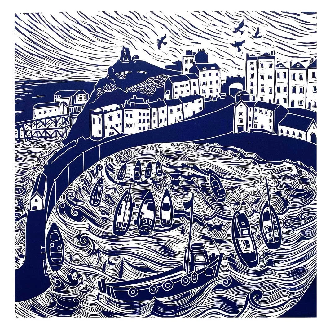 Most single colour prints are a hand mixed deep blue ink on soft cream paper. It is often hard to capture this accurately through photography and so advise you that the physical print may look slightly different in shade of colour, to the image on screen. There is also slight variance in shade of blue depending on the batch of ink mixed. Therefore each print may vary slightly due to the particular mix and distribution of ink, which is all part of its handmade charm.